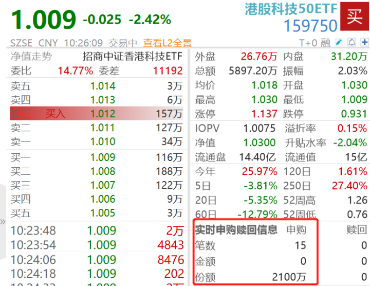 场内热门ETF方面,港股科技50ETF(159750)跌2.42%,实时成交近5900万,较前一交易日放量;行情数据显示,盘中获资金踊跃申购。