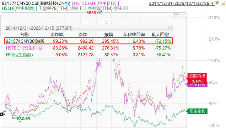 覆盖“中国十大科技股”(阿里巴巴、京东集团、吉利汽车、比亚迪股份、小米集团、腾讯控股、网易、百度集团、美团和中芯国际)的港股科技指数(931574)相对恒生科技指数表现更优。港股科技指数(CNY)自基日2014年12月31日至2025年12月15日,累计涨幅99.23%,同期恒生科技指数涨幅83.28%。